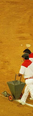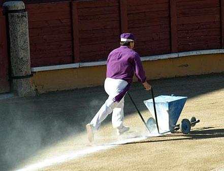 La segunda tarea de los areneros es la eliminación de los despojos , restos de sangre y ocultar la huella de sangre que deja del toro durante el arrastre.