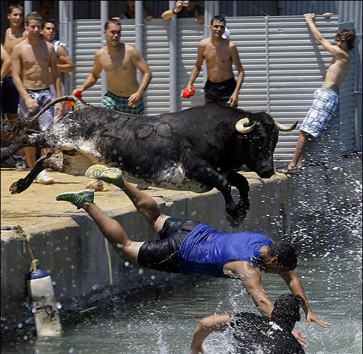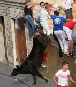Quesero, el toro volador de Tafalla ( Navarra ). Final de recortadores , 18 agosto 2010. El novillo de Ana Corera de Larraga y de nombre Quesero había sido devuelto a los corrales porque había saltado dos veces antes la barrera y se había roto un cuerno, saltó por tercera y alcanzó la Grada 2 del tendido sol, que estaba repleto de gente. Es la versión completa del video anterior. El animal había desarrollado la capacidad de saltar y finalmente consiguió escapar saltando al tendido . Un cámara de TV muy valiente en la Feria de San Isidro en Madrid